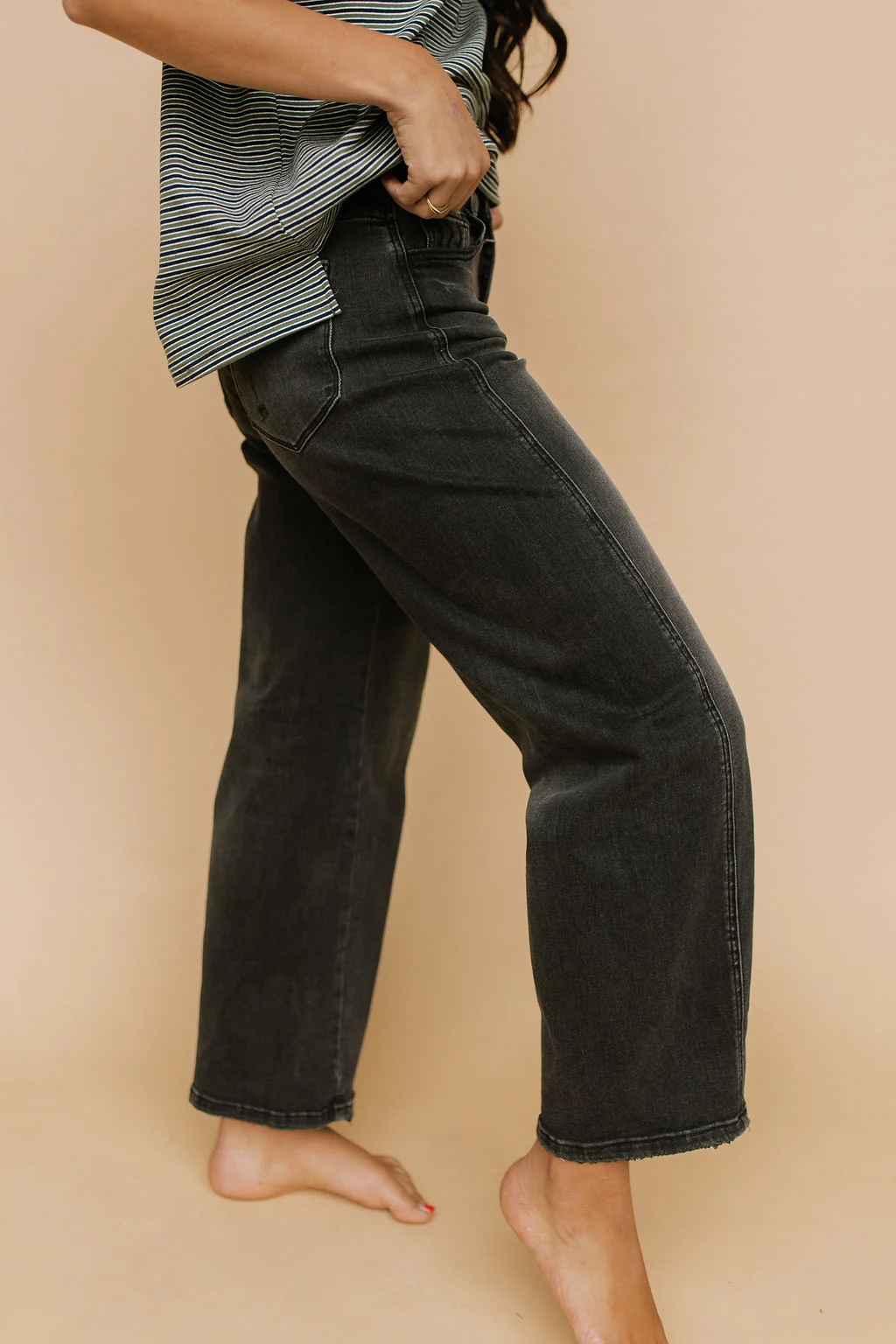 Details: Black slightly washed barrel jeans with good stretch!